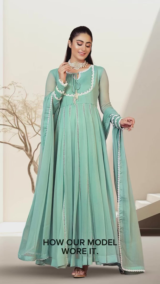 . Introducing the 'Amirah' Light Aqua Outfit, crafted from luxurious chiffon material, with a stitched inner attached for comfort and ease. The delicate lace finishing on the dupatta and tussled neck, paired with lace sleeves and plate finishing, create an effortlessly elegant look.