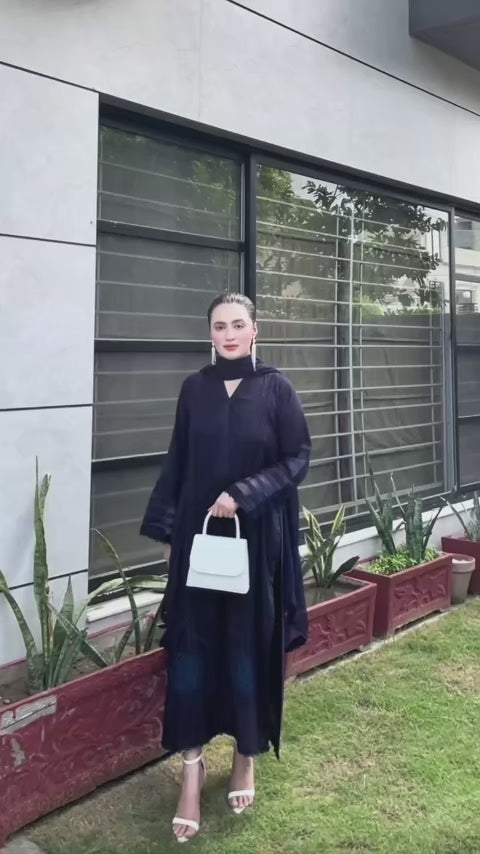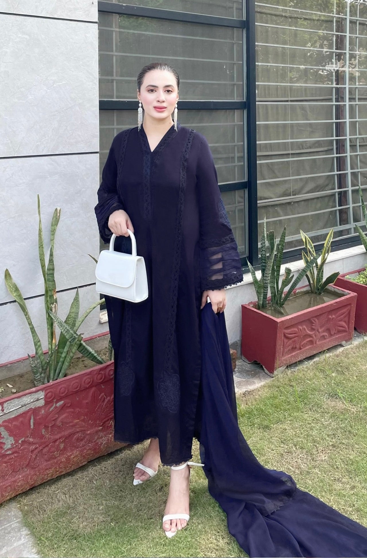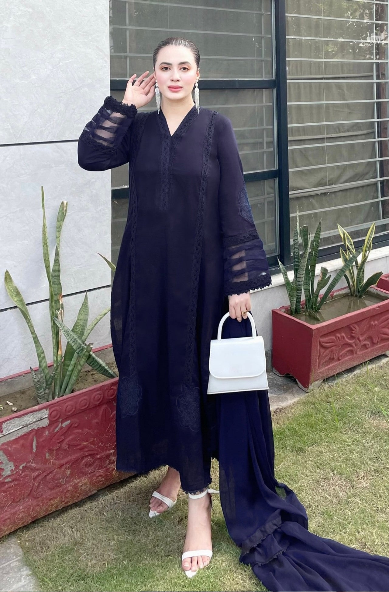 A timeless navy blue embroidered long shirt, beautifully adorned with delicate laces that add a graceful touch to the design. Paired with a sleek, fitted trouser and a pure chiffon dupatta finished with lace on all four sides, this outfit blends elegance with ease.