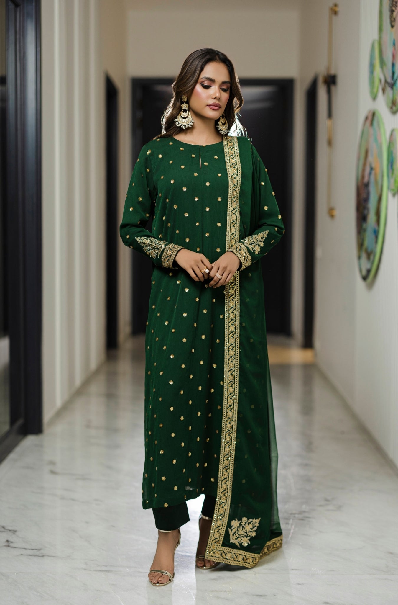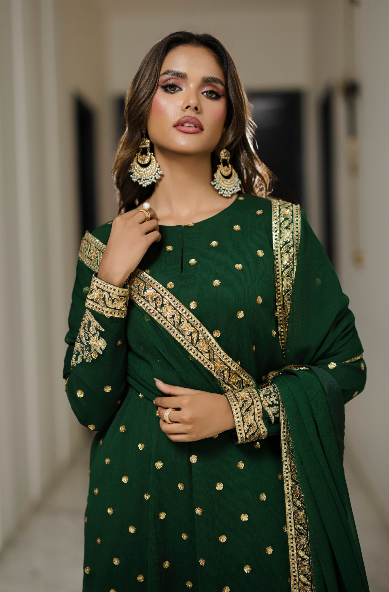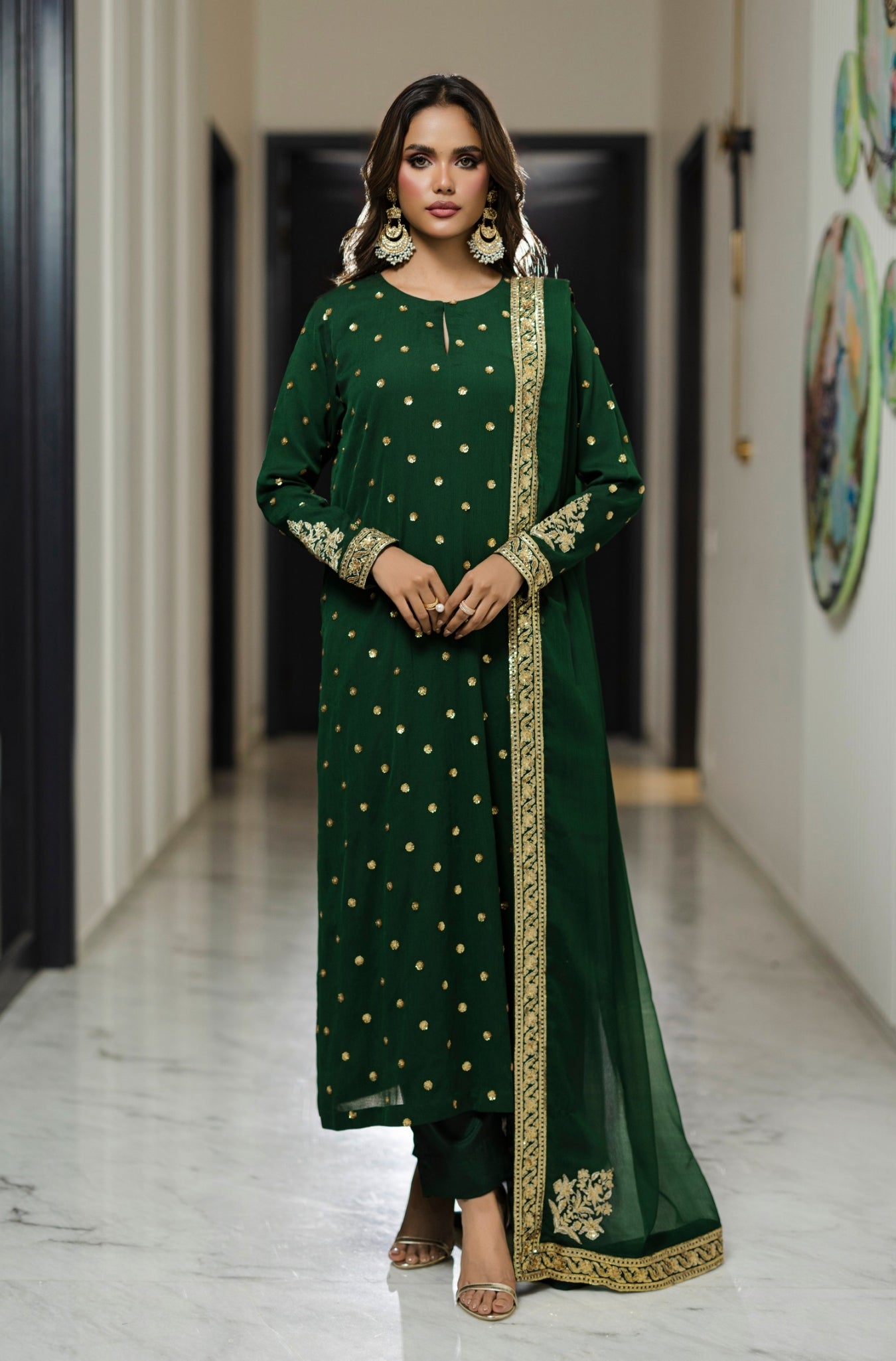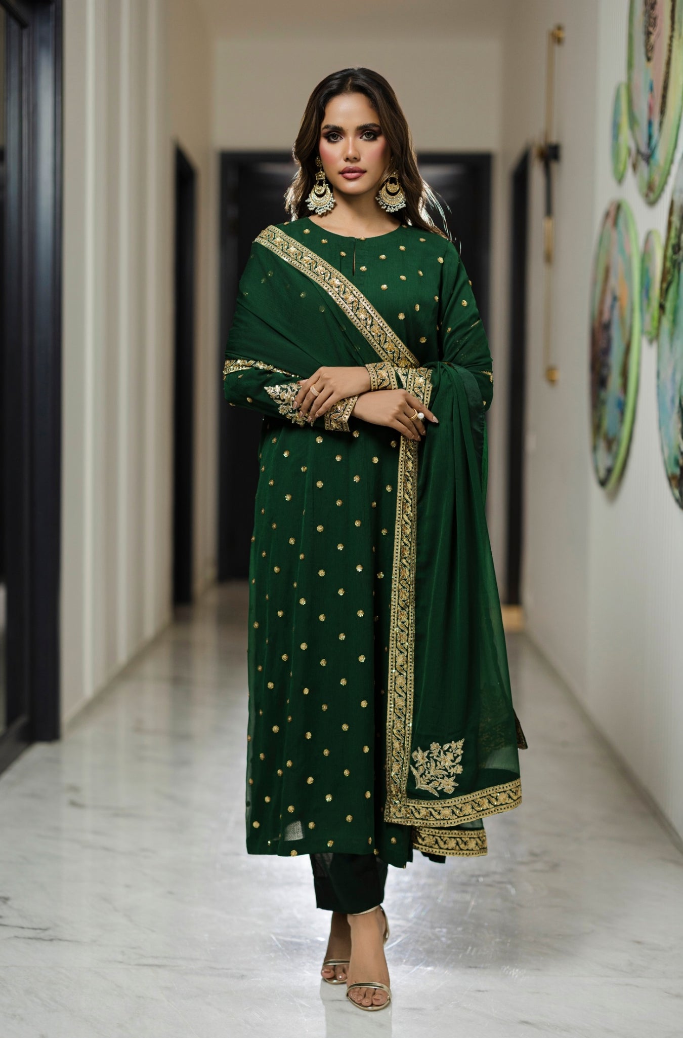 Green Flag Girlie is crafted in soft, flowing chiffon that feels gentle on the body, perfect for a comfortable yet stylish look. The shirt and dupatta feature intricate and sophisticated gold embroidery, adding a touch of luxury while keeping the overall style minimal and elegant. Paired with a plain, airy trouser, this ensemble allows your personality to shine, proving that confidence and grace are the ultimate accessories.