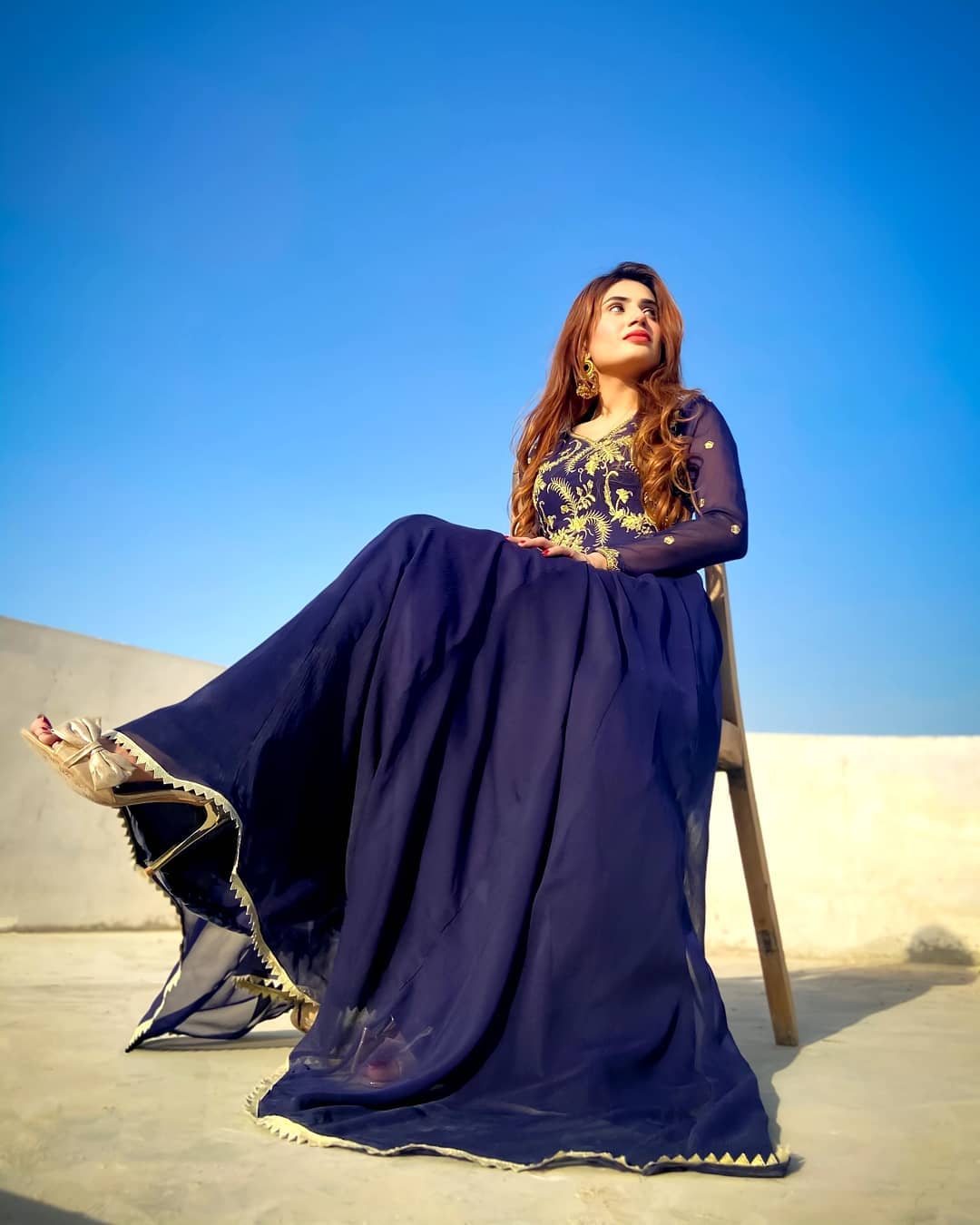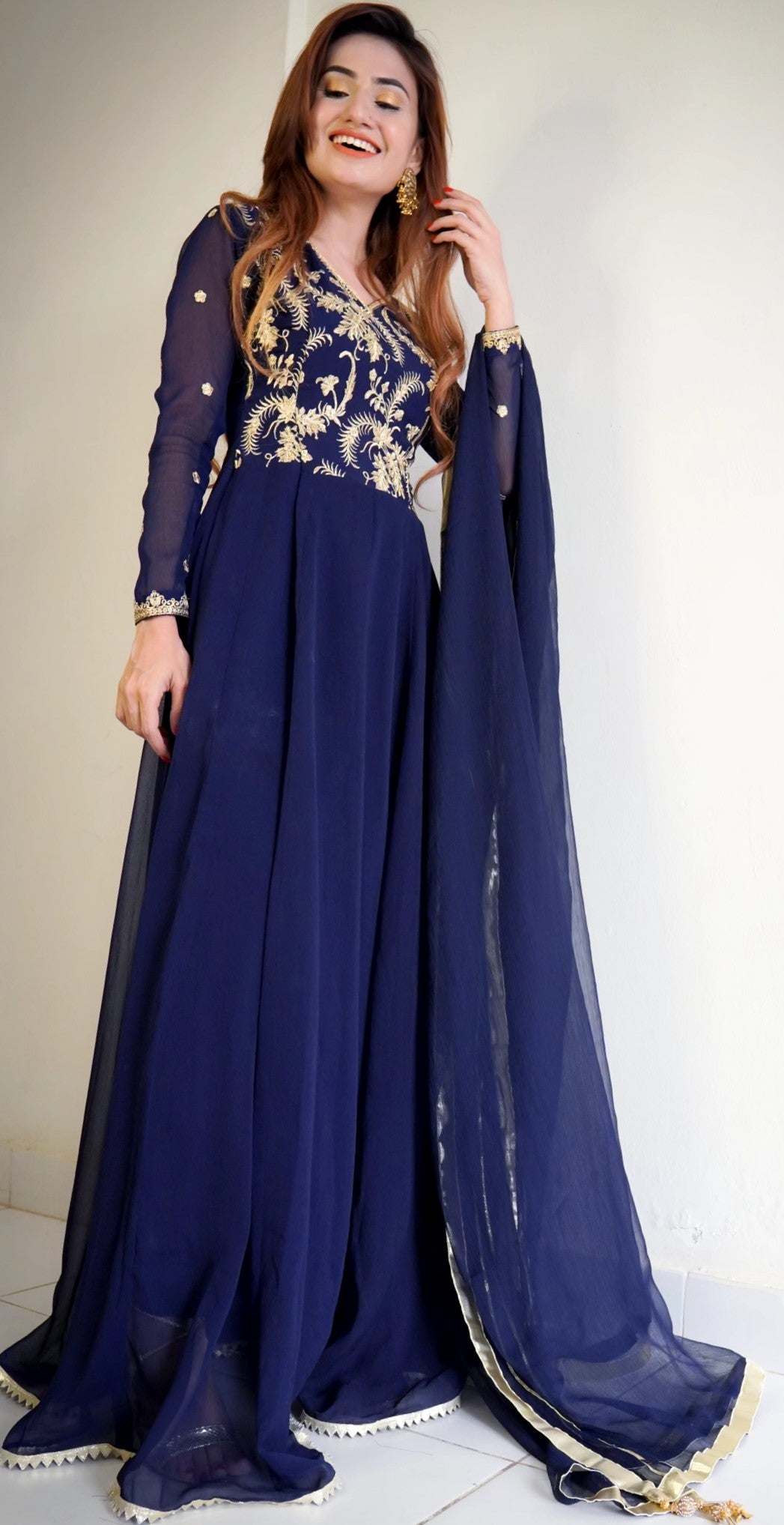 "Neelum" Is Ready To Wear 'Deep Blue' Chiffon Kalidar, It's Floor Length Outfit In 185+ Inches Flare, From OW Luxury Chiffon Collection. (Stitched With Inner Attached), Paired With Dupatta. Intricately Embroidered Body And Sleeves, Border And Sleeves Finishing With Delicate Gota, Fabric Quality, Stitching And Work All Are First-Rate.