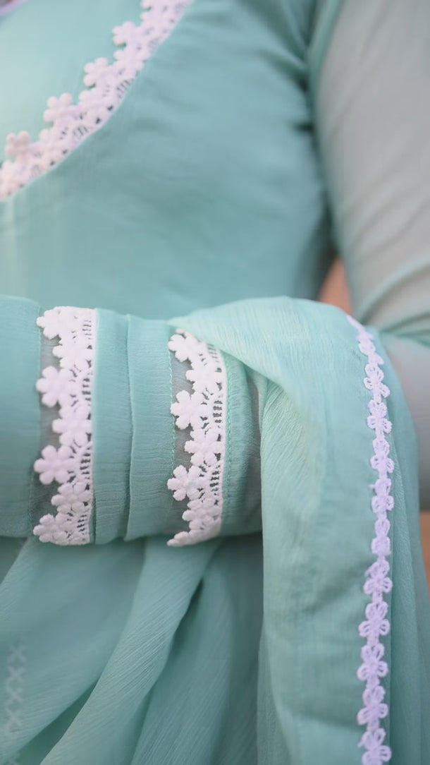 . Introducing the 'Amirah' Light Aqua Outfit, crafted from luxurious chiffon material, with a stitched inner attached for comfort and ease. The delicate lace finishing on the dupatta and tussled neck, paired with lace sleeves and plate finishing, create an effortlessly elegant look.