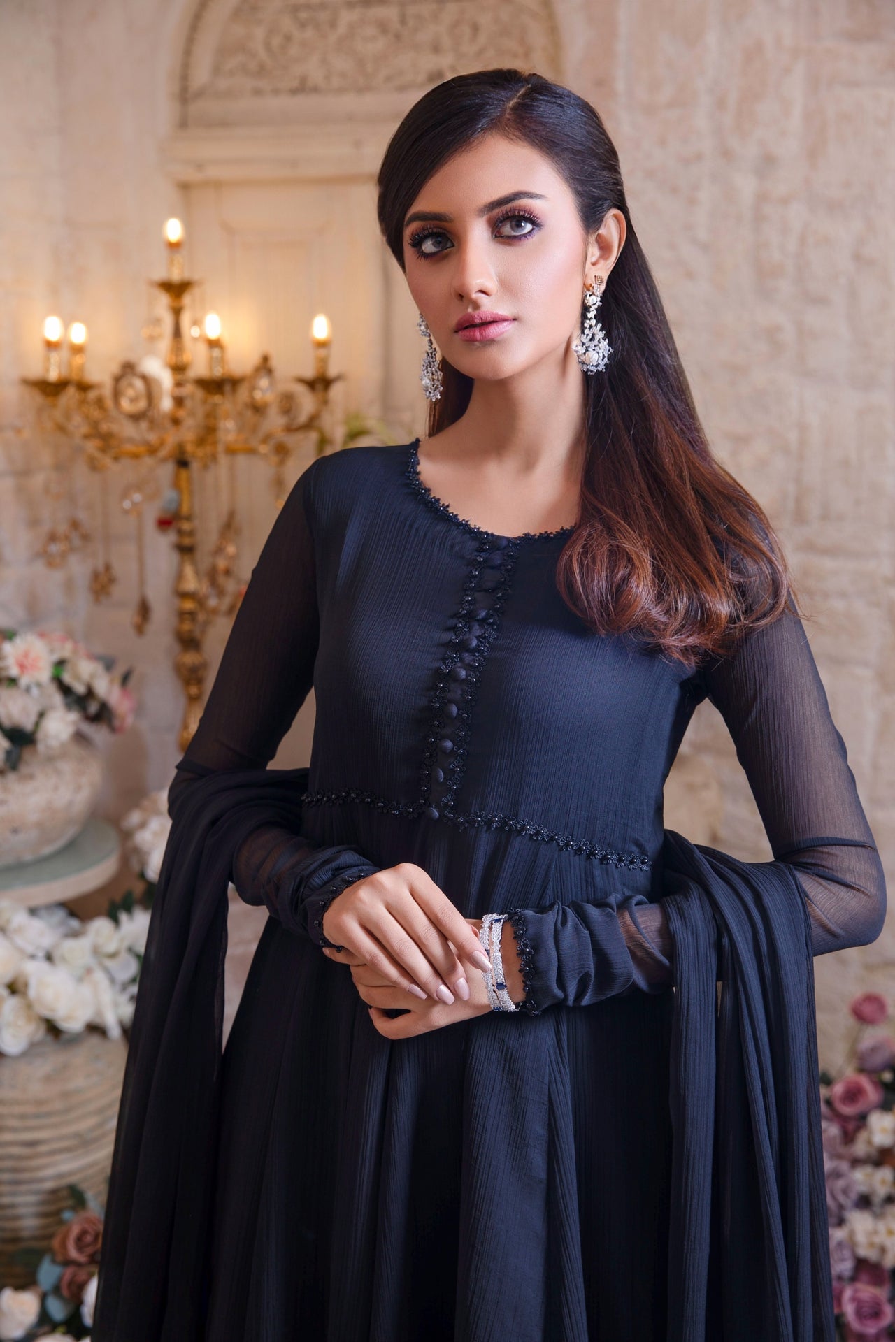 . The Most beautiful ( Black ) Chiffon Kalidaar (Stitched With Inner Attached). Same Color Delicate Lace And Pearl Embellishment On Body And Sleeves,And Churidaar Sleeves Makes This Outfit More Eastern And Classic.
