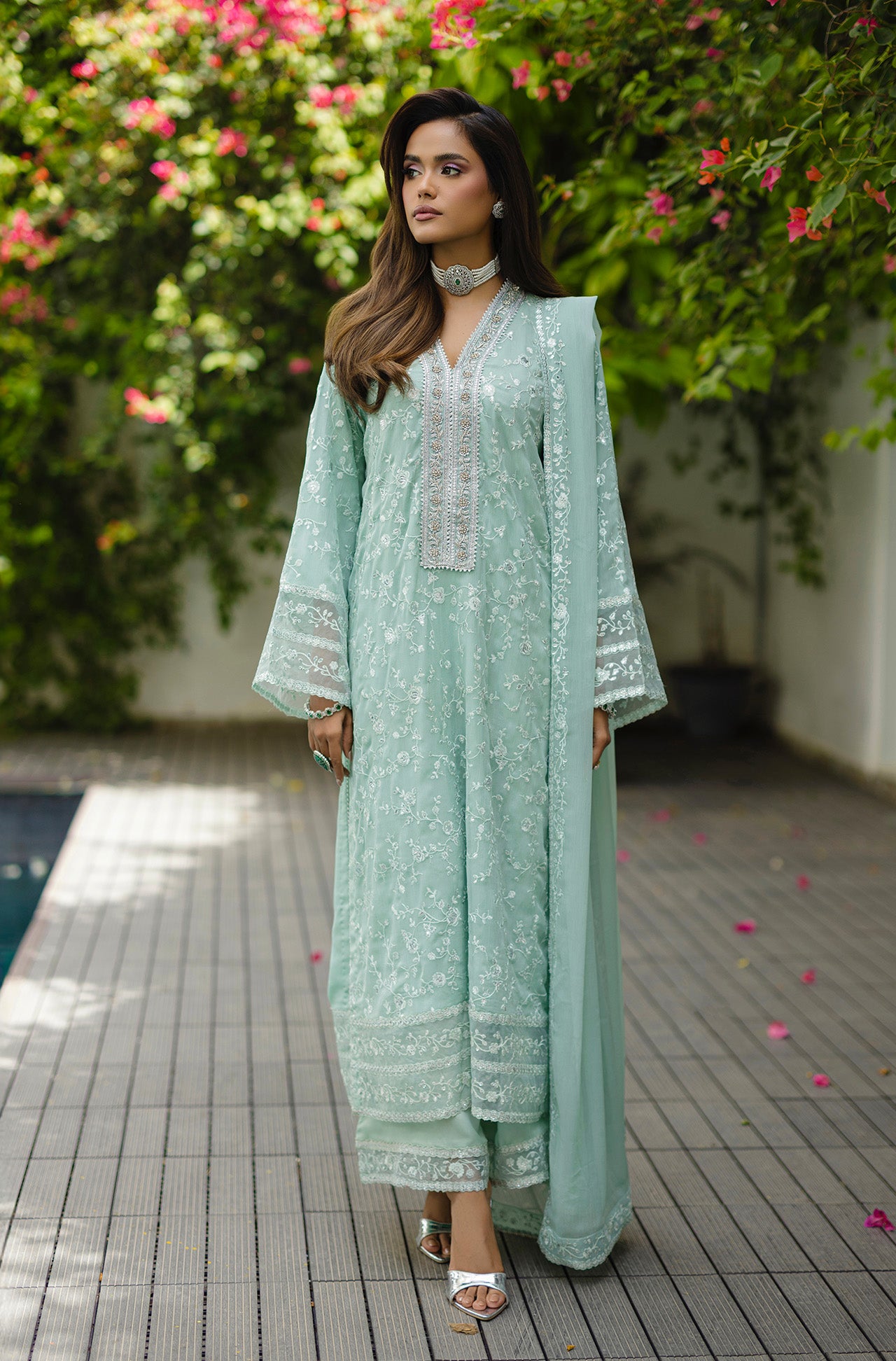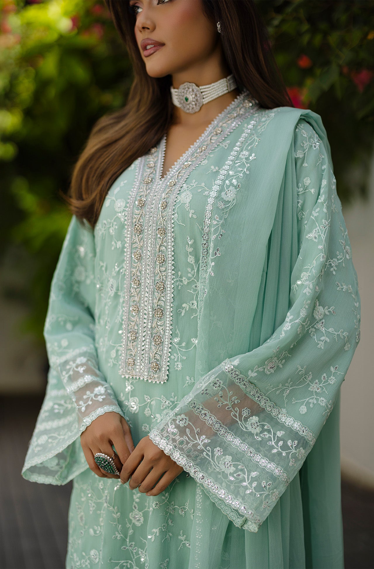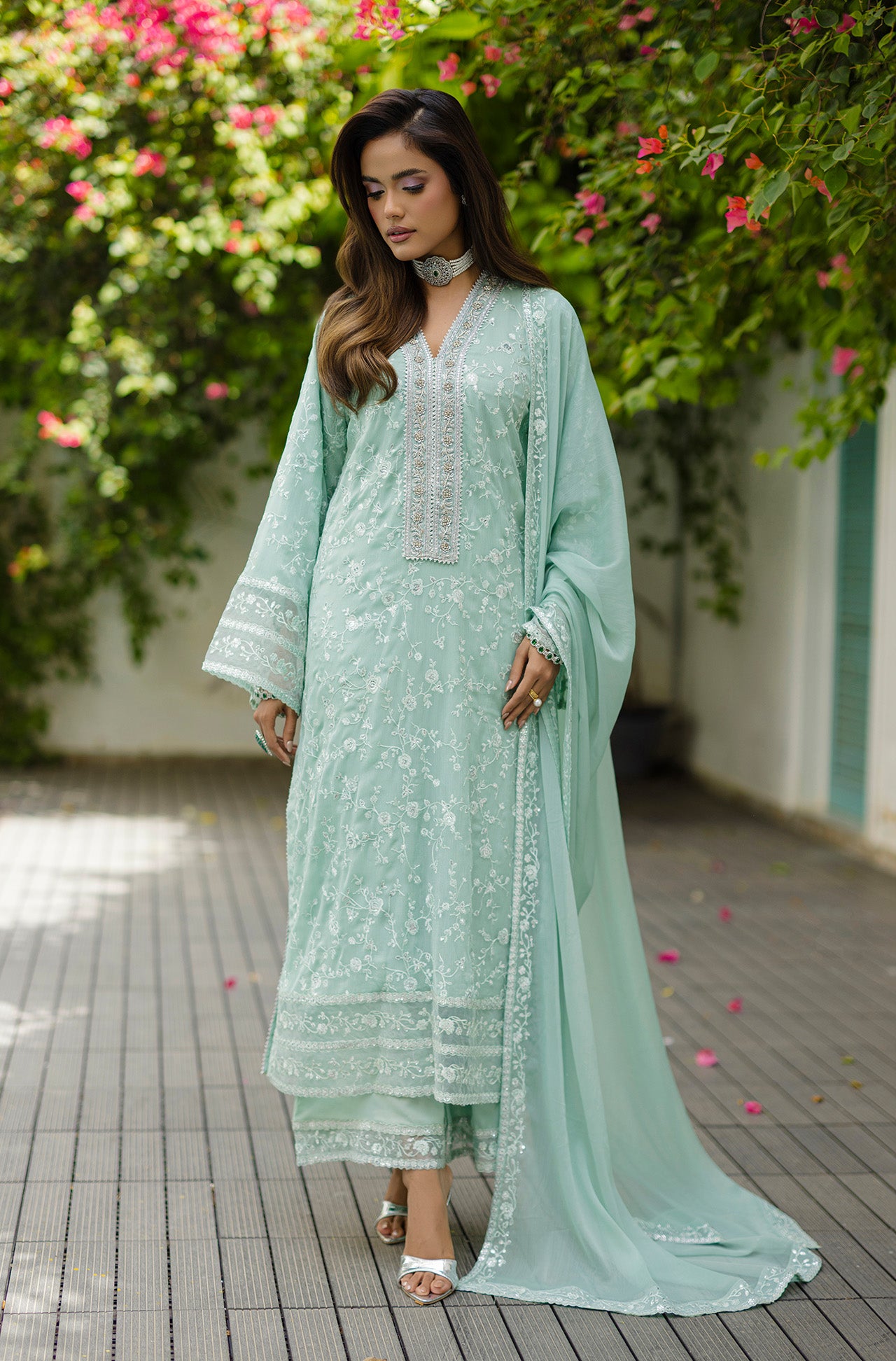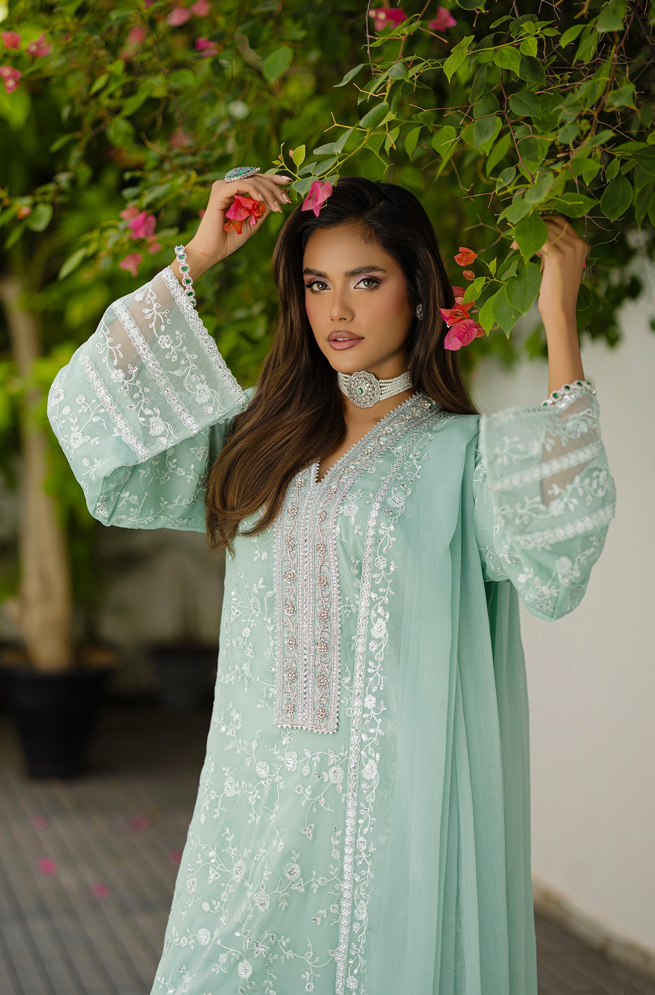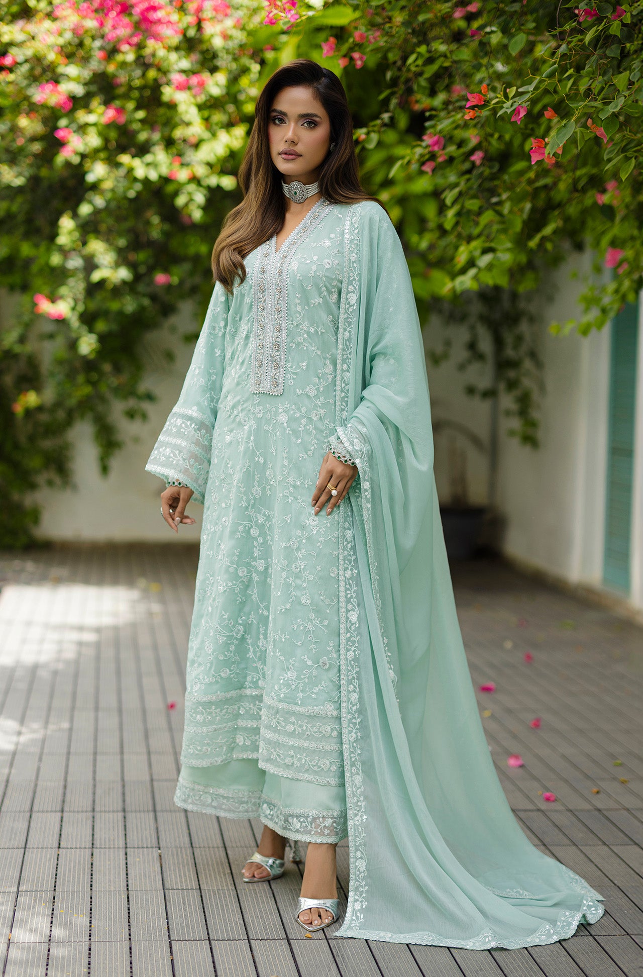 Perfect for daytime festivities, Eid brunches, or intimate celebrations, Serene Aqua Bloom embodies grace and serenity. Its soothing pastel hue and delicate embroidery make it a timeless choice , one that reflects soft beauty, gentle confidence, and effortless elegance.