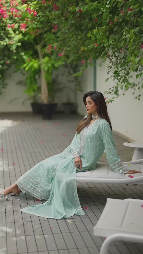 This pastel aqua outfit is a dreamy blend of pure chiffon’s delicacy and timeless craftsmanship. The heavy embroidered jaal, enhanced with silver sequins, shimmers gracefully with every movement, while the neckline adorned with dabka and stone work adds a regal, feminine charm.
