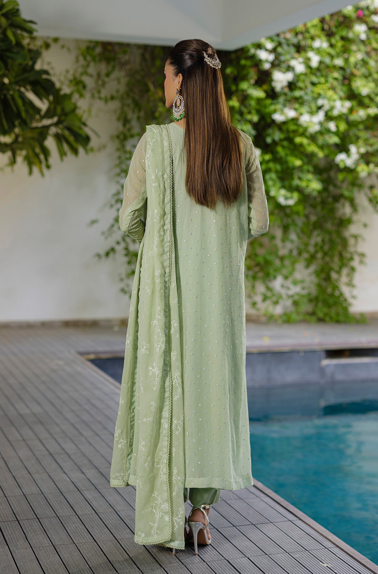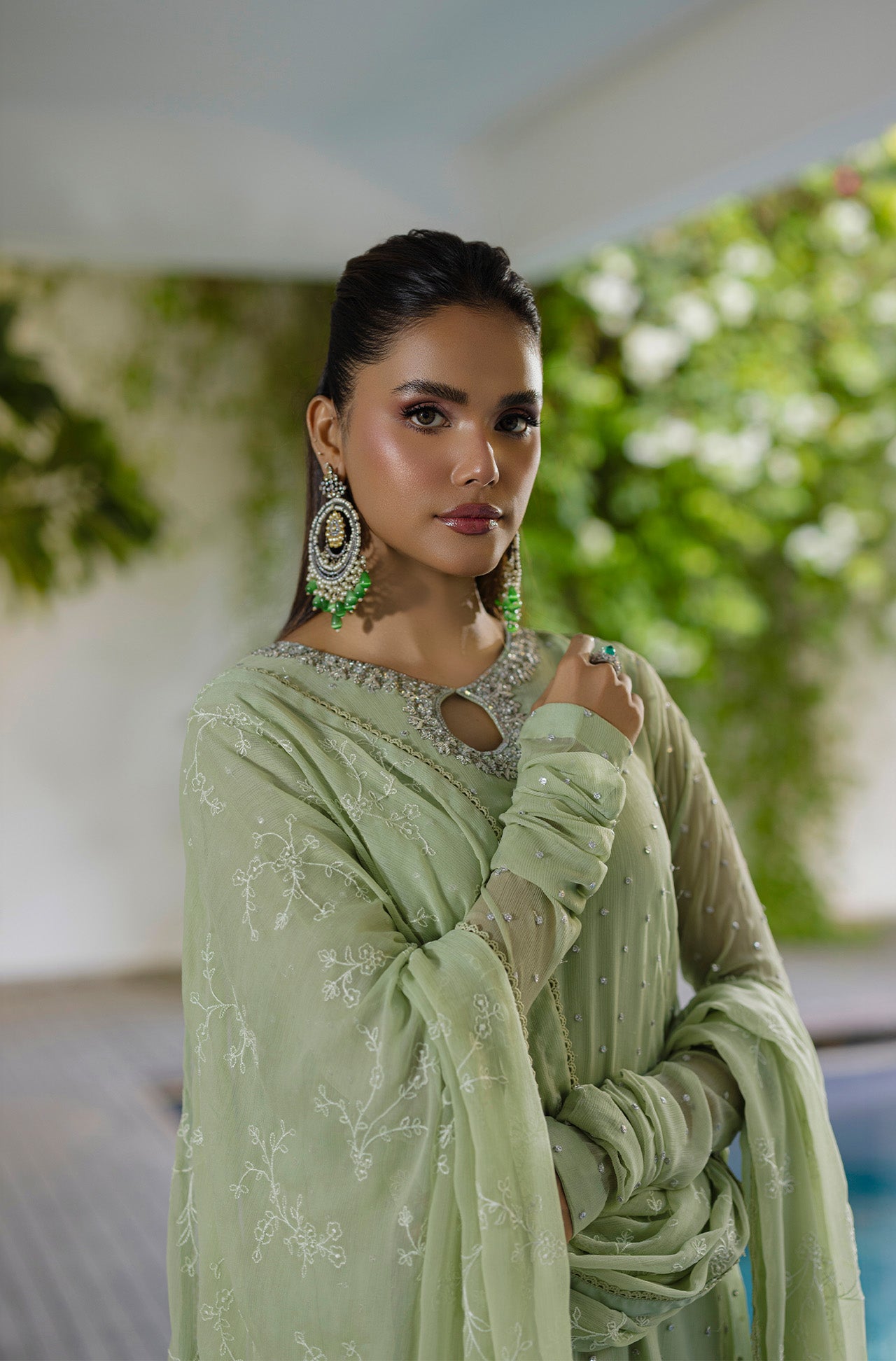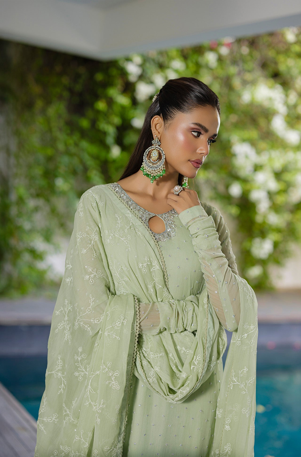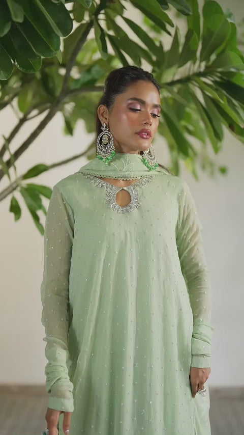 This pastel pistachio three-piece outfit is a perfect blend of softness and sophistication. The shirt is crafted from the softest pure chiffon known for its airy flow and premium quality making it feel as light as it looks. The neckline is beautifully handcrafted with dabka, stone, and zari embroidery on the front, back, and sleeves, giving it that dreamy, filmy charm.