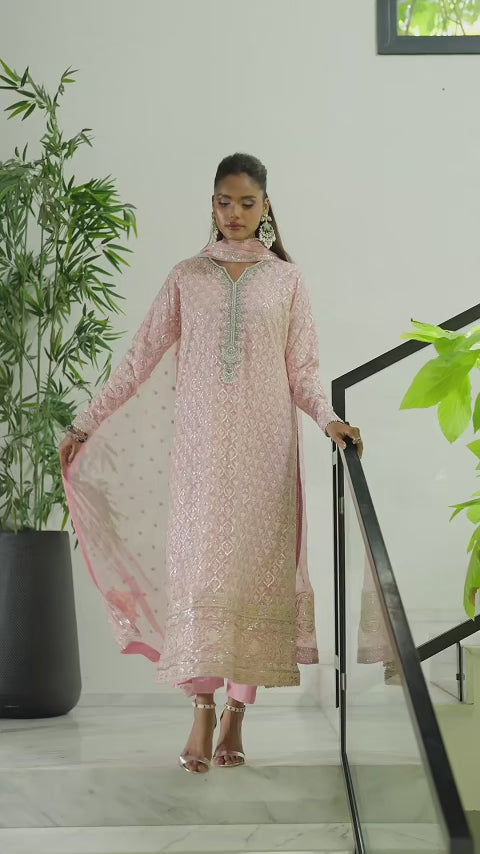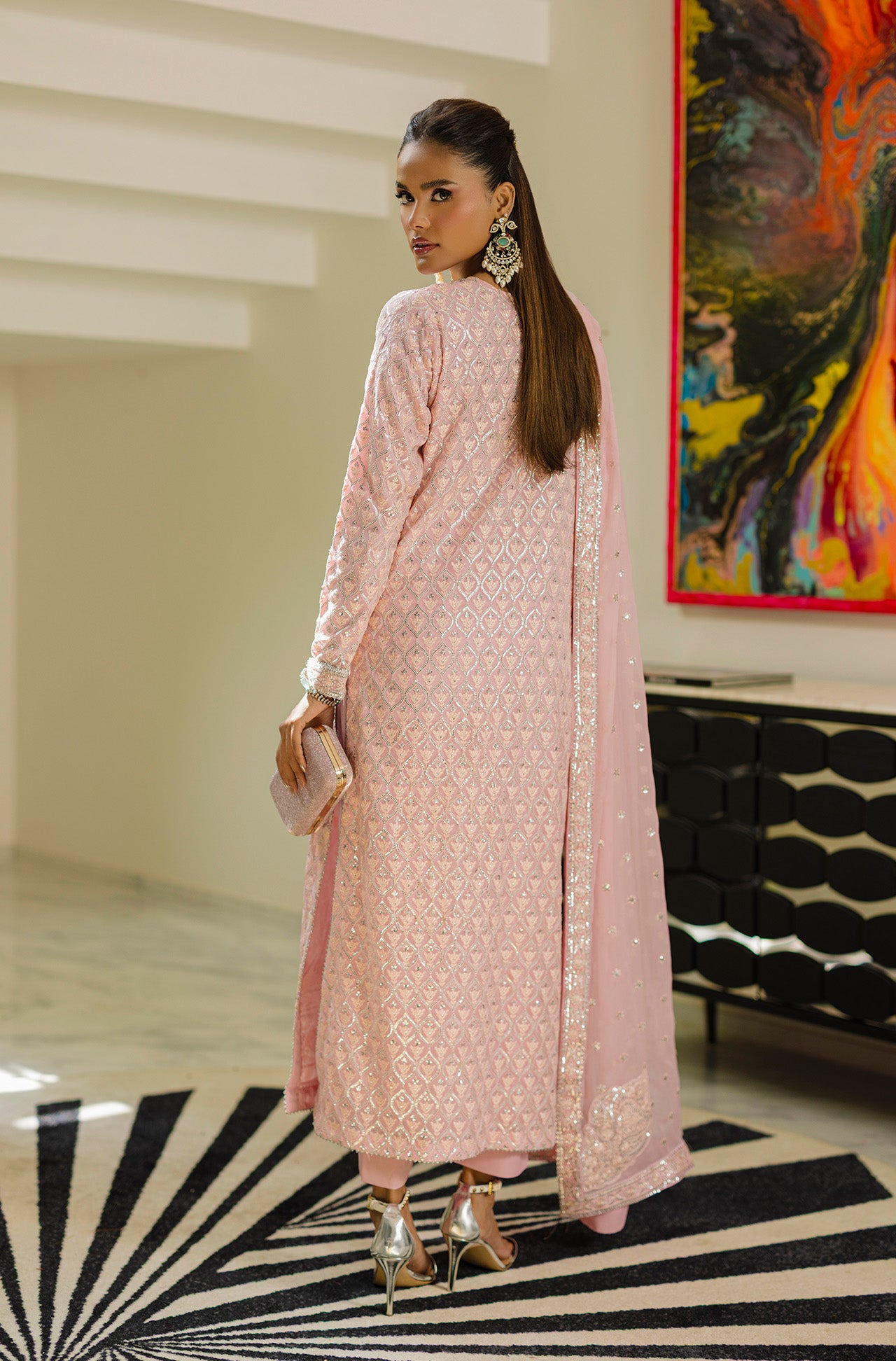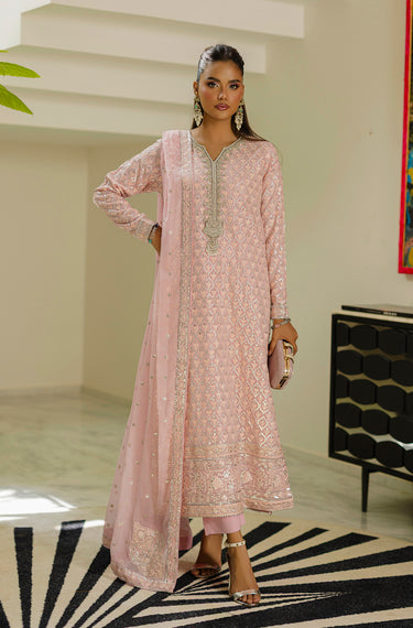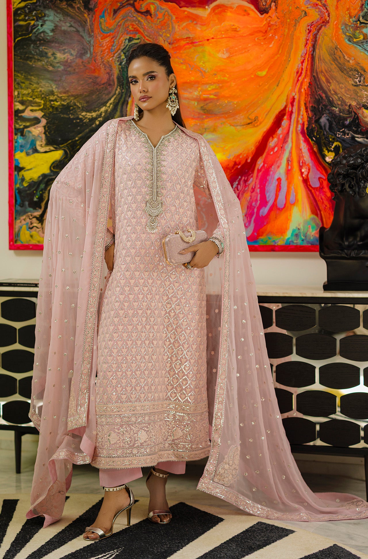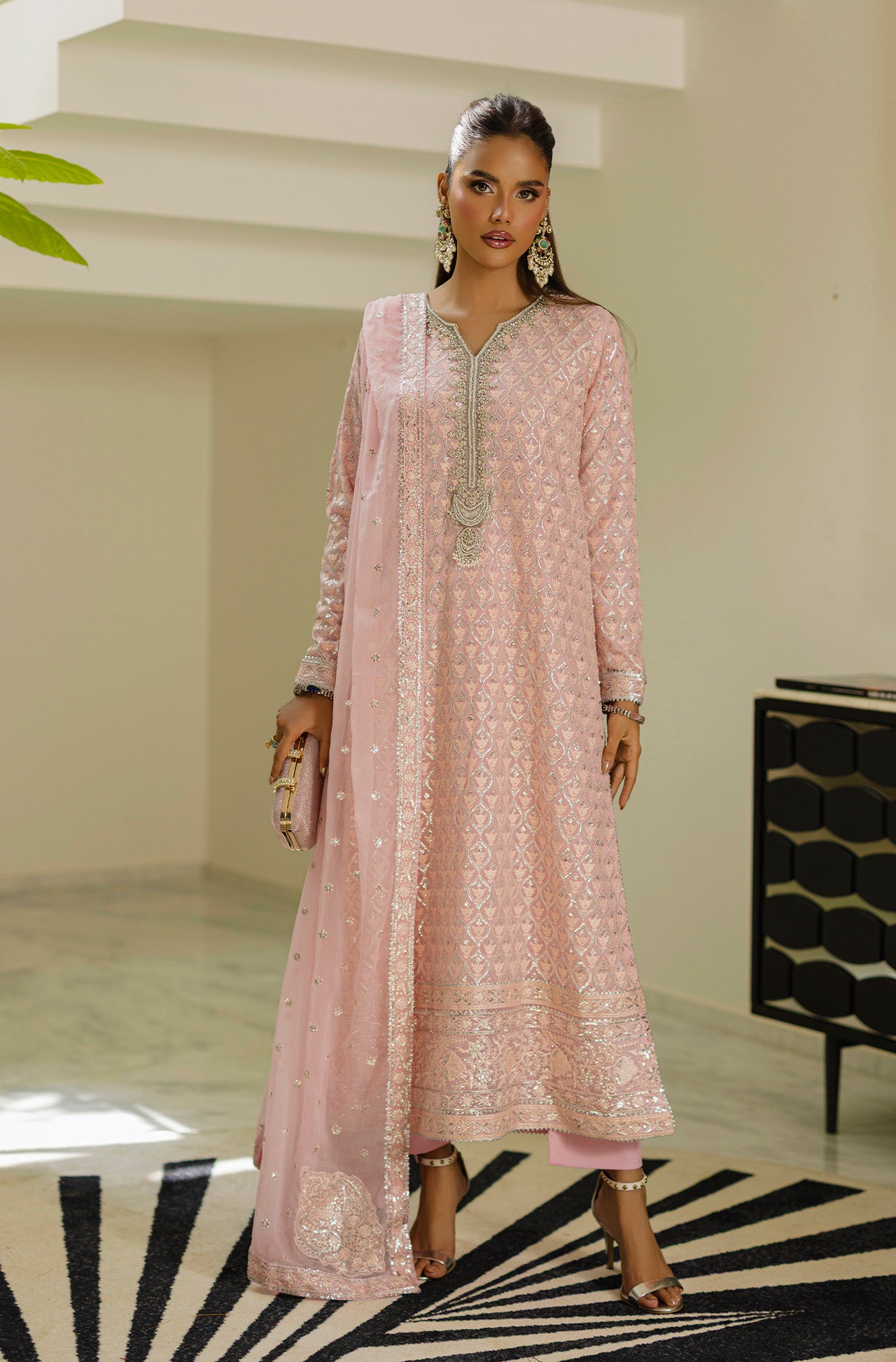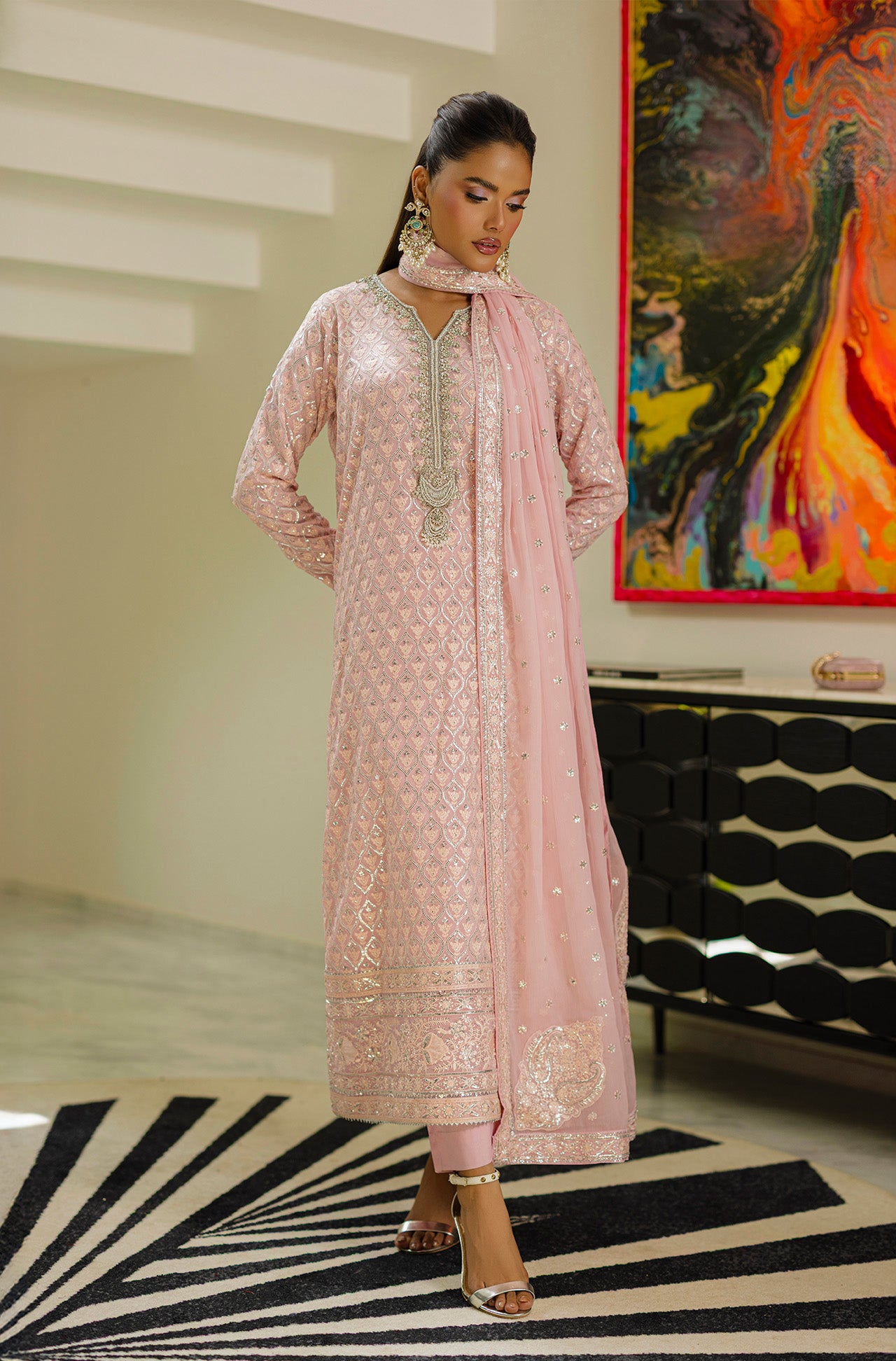 The neckline, adorned with intricate dabka and stone work, adds a precious touch of femininity and elegance. The pure chiffon dupatta, beautifully embroidered, enhances the dreamy and luxurious look, while the straight-fit viscose trouser ensures perfect comfort with effortless sophistication.