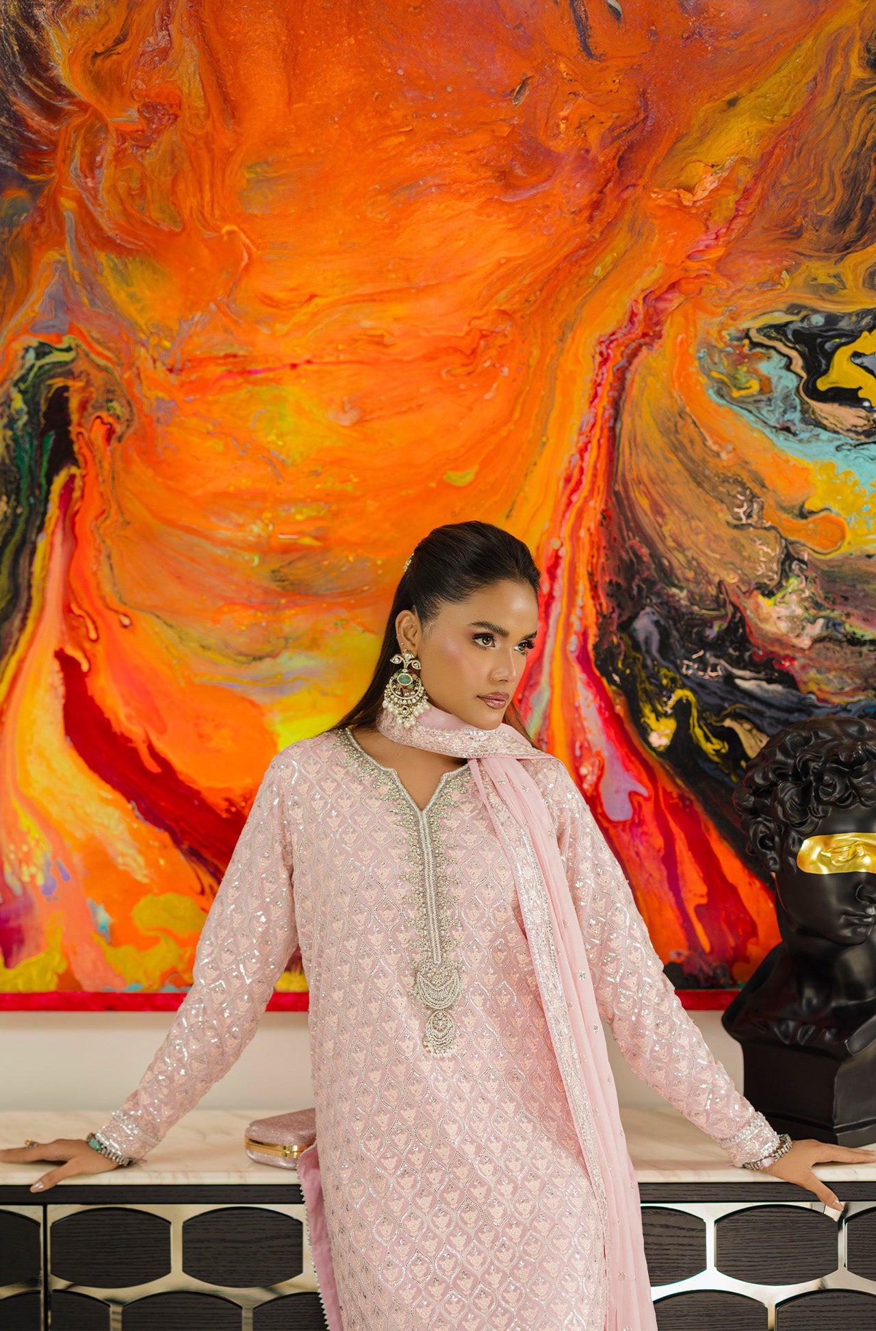 Sakura Femininity is a regal masterpiece crafted in pure chiffon, known for its delicate drape and soft, weightless flow. The shirt features a heavily embroidered jaal enhanced with silver sequins, creating a luminous, starry shimmer.