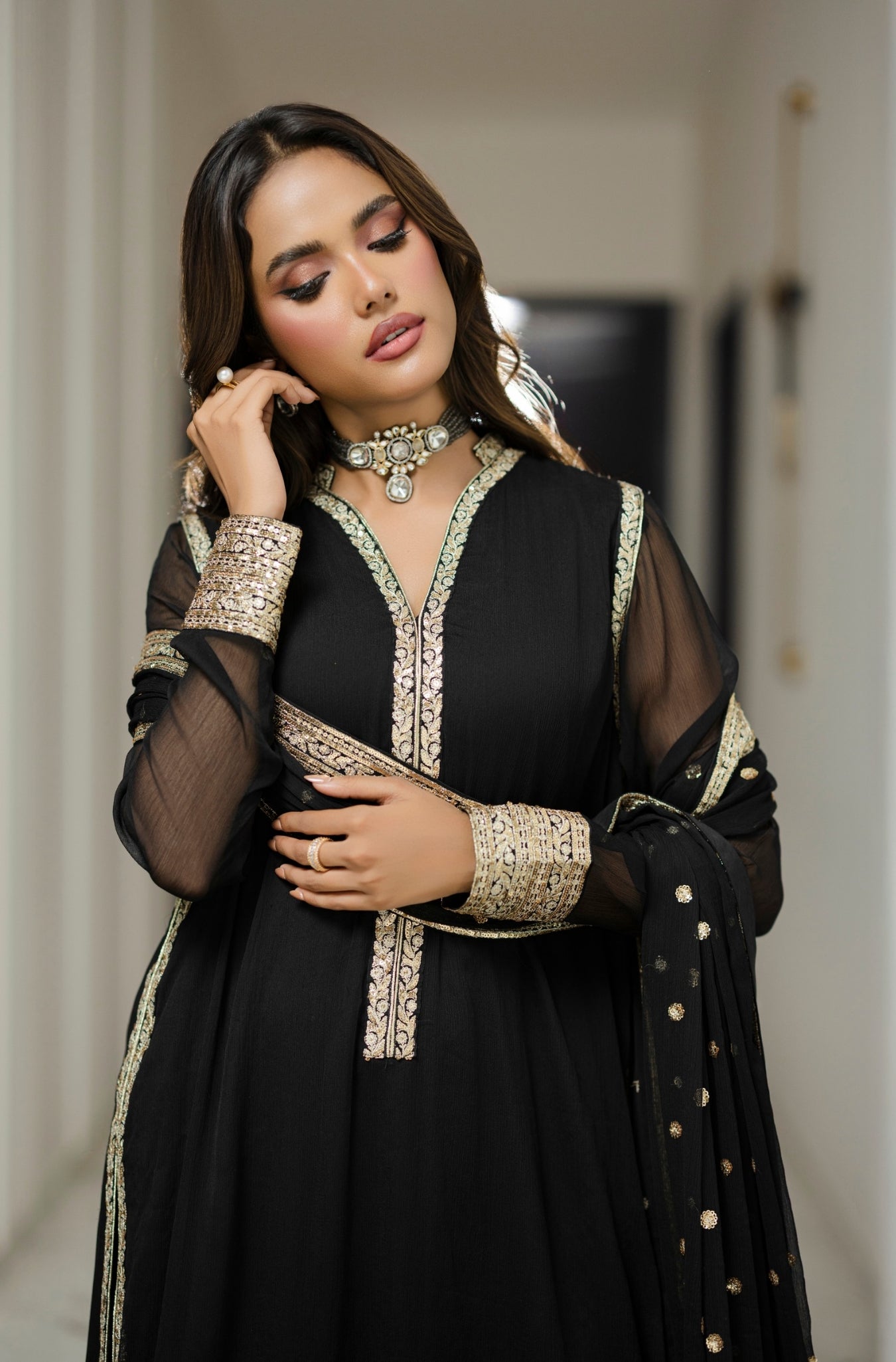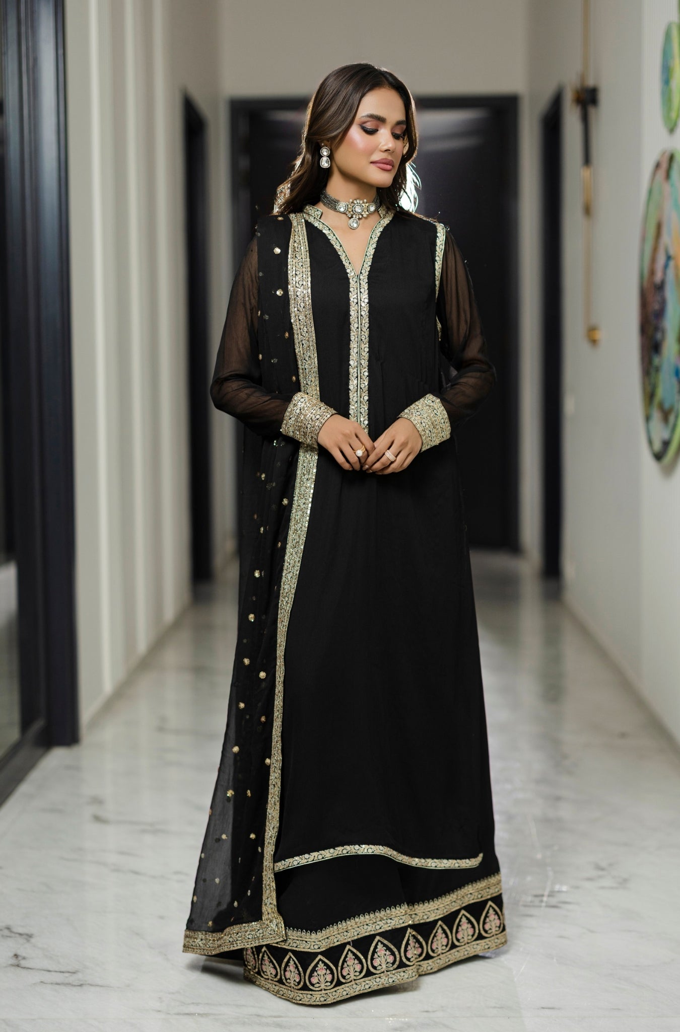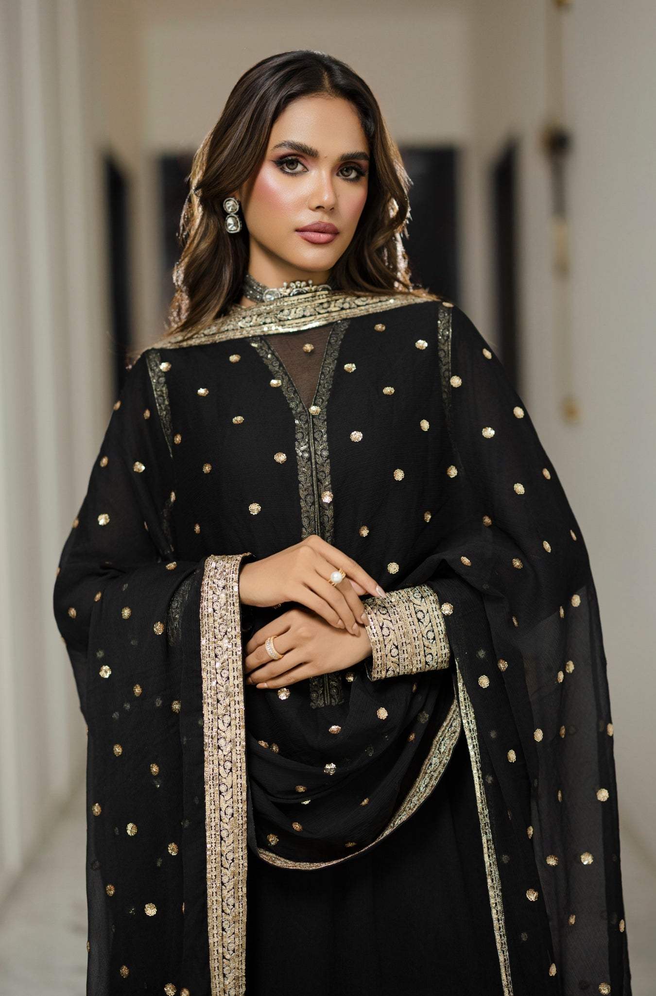 BOSS LADY is crafted in soft, flowing chiffon that feels gentle on the body. The shirt features golden embroidery with sparkling sequins, paired with an embroidered dupatta and matching embroidered trouser. This set balances luxury and comfort, made for women who own every moment with style and grace.