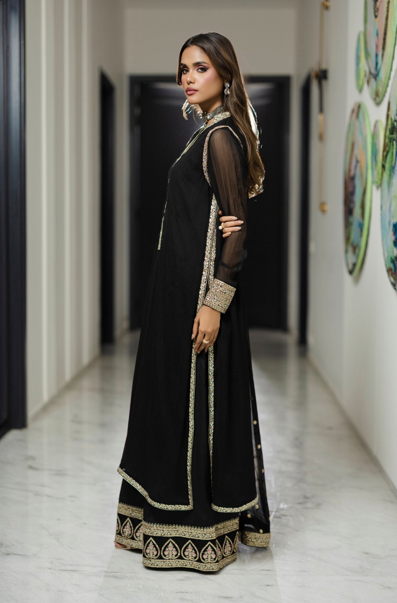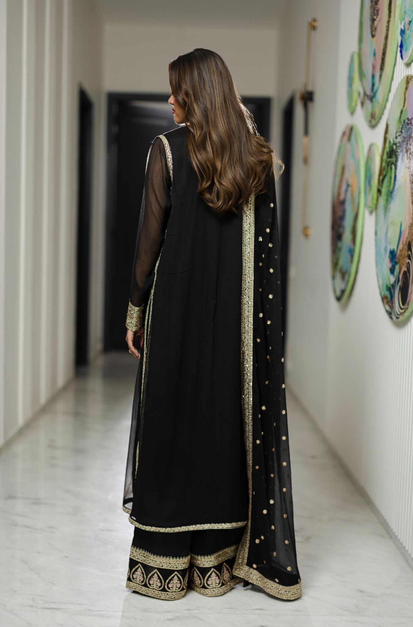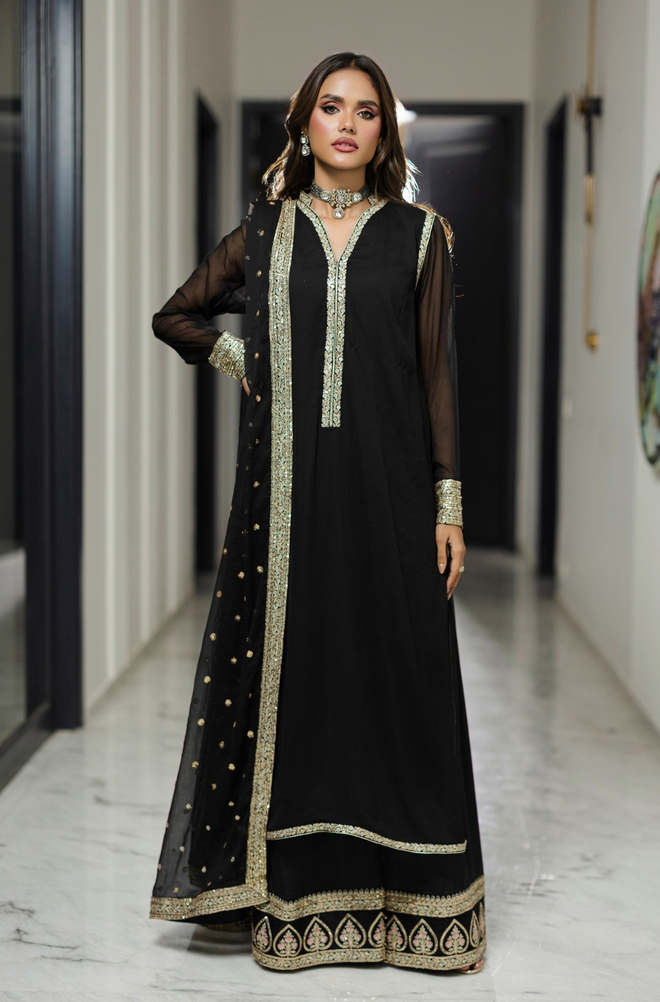 BOSS LADY is crafted in soft, flowing chiffon that feels gentle on the body. The shirt features golden embroidery with sparkling sequins, paired with an embroidered dupatta and matching embroidered trouser. This set balances luxury and comfort, made for women who own every moment with style and grace.