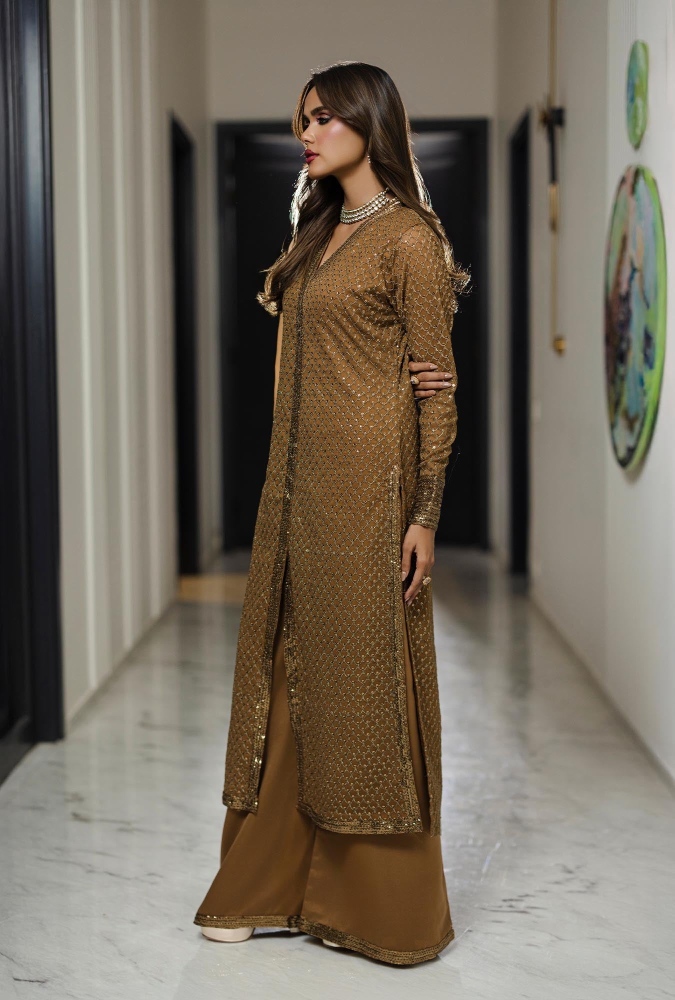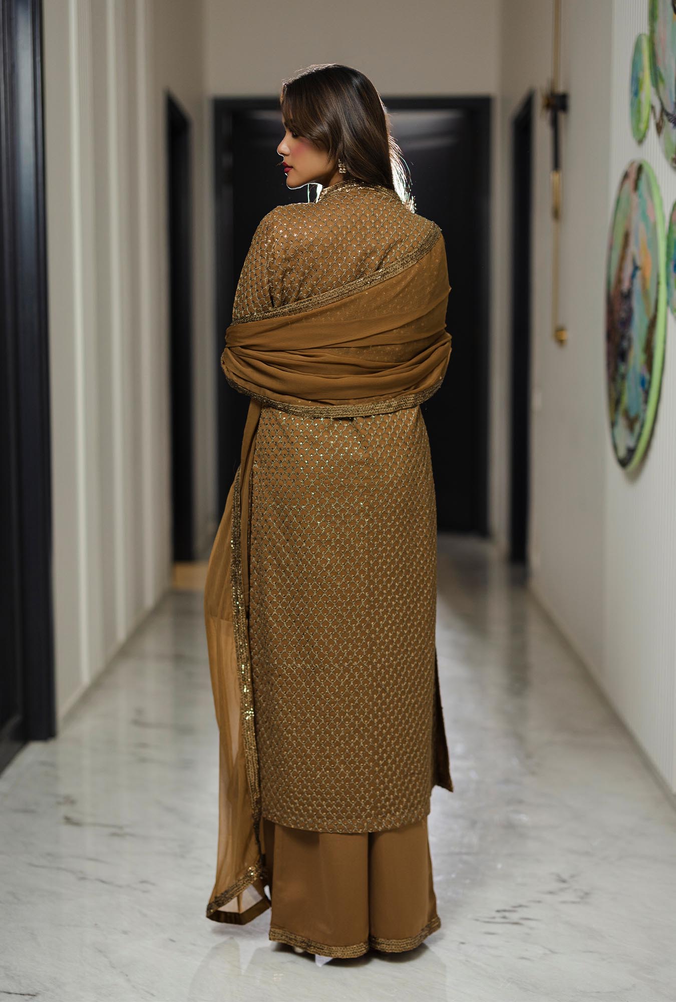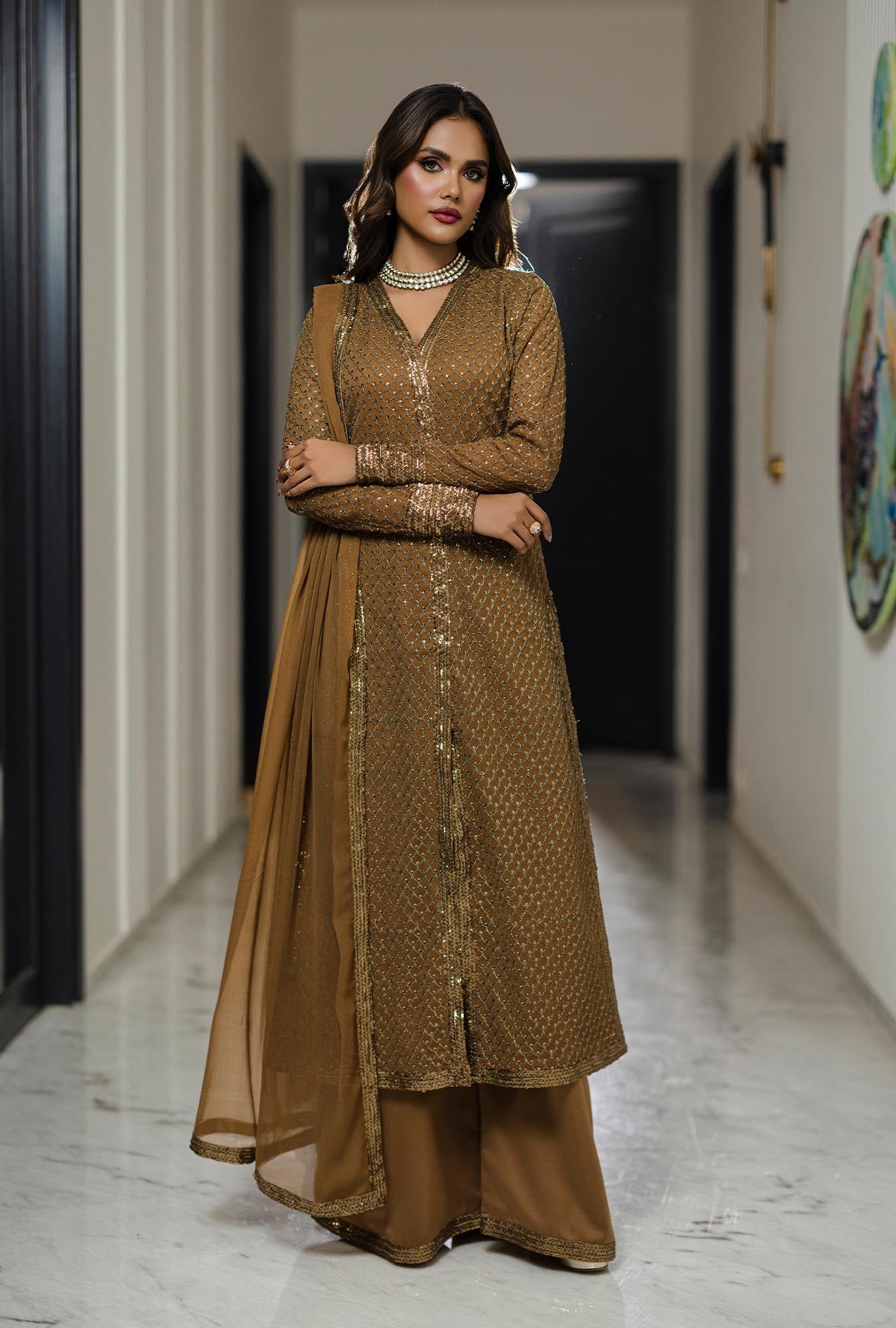 Brown Baddie is crafted in pure chiffon, elevated with an all-over sequins jaal that adds a subtle yet striking shimmer. The knee-to-long length shirt is finished with a refined center slit, adding graceful movement and understated glamour. Paired with a sleek silk trouser featuring an embroidered border, the outfit creates a perfect balance of shine and elegance. The look is completed with a chiffon dupatta, detailed with four-sided sequins embroidered patti, giving the ensemble a polished and luxurious finish.