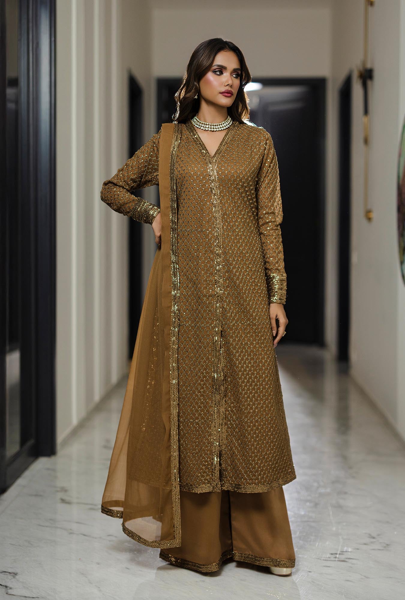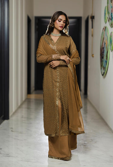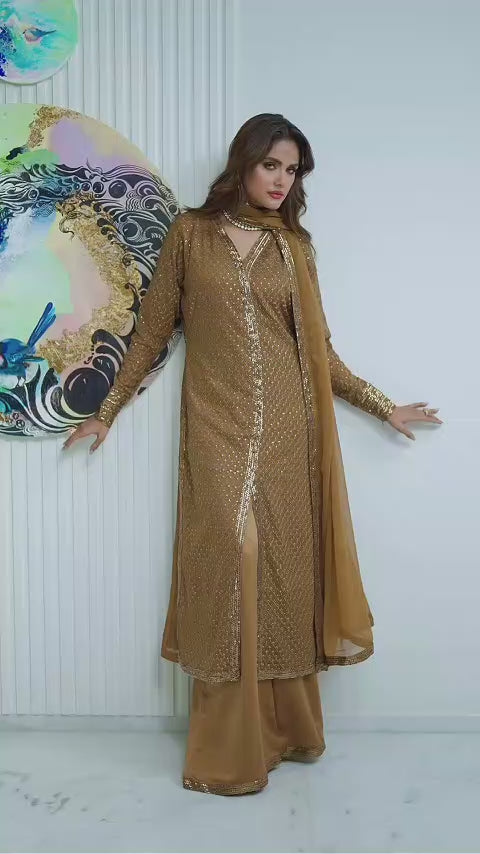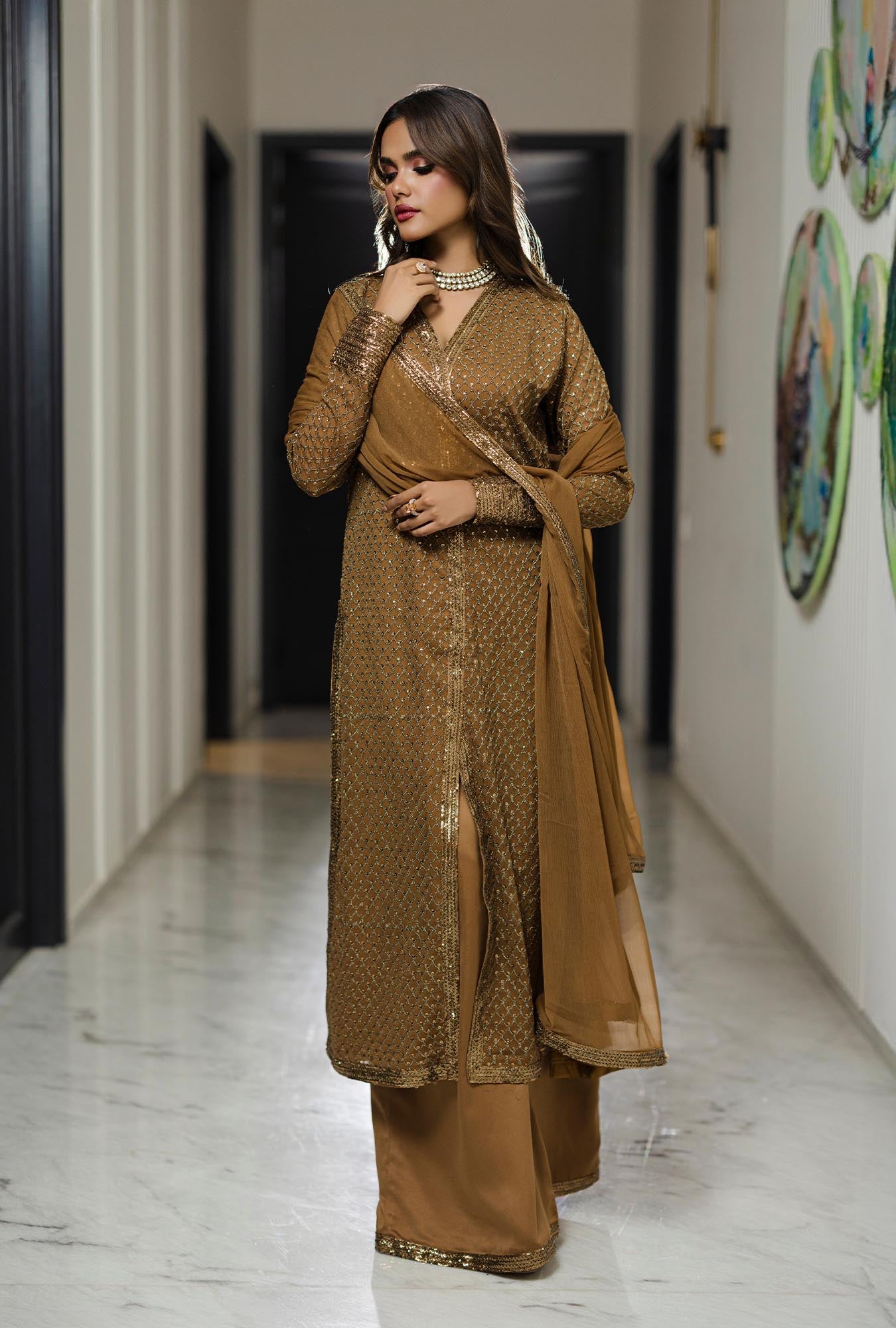 Brown Baddie is crafted in pure chiffon, elevated with an all-over sequins jaal that adds a subtle yet striking shimmer. The knee-to-long length shirt is finished with a refined center slit, adding graceful movement and understated glamour. Paired with a sleek silk trouser featuring an embroidered border, the outfit creates a perfect balance of shine and elegance. The look is completed with a chiffon dupatta, detailed with four-sided sequins embroidered patti, giving the ensemble a polished and luxurious finish.