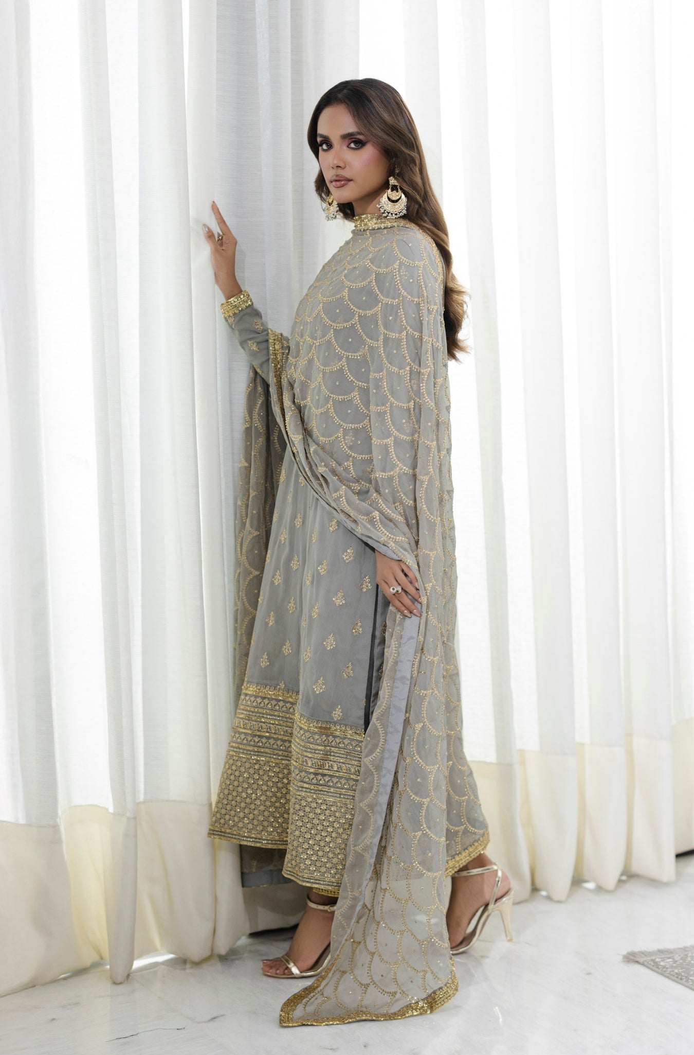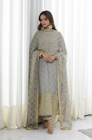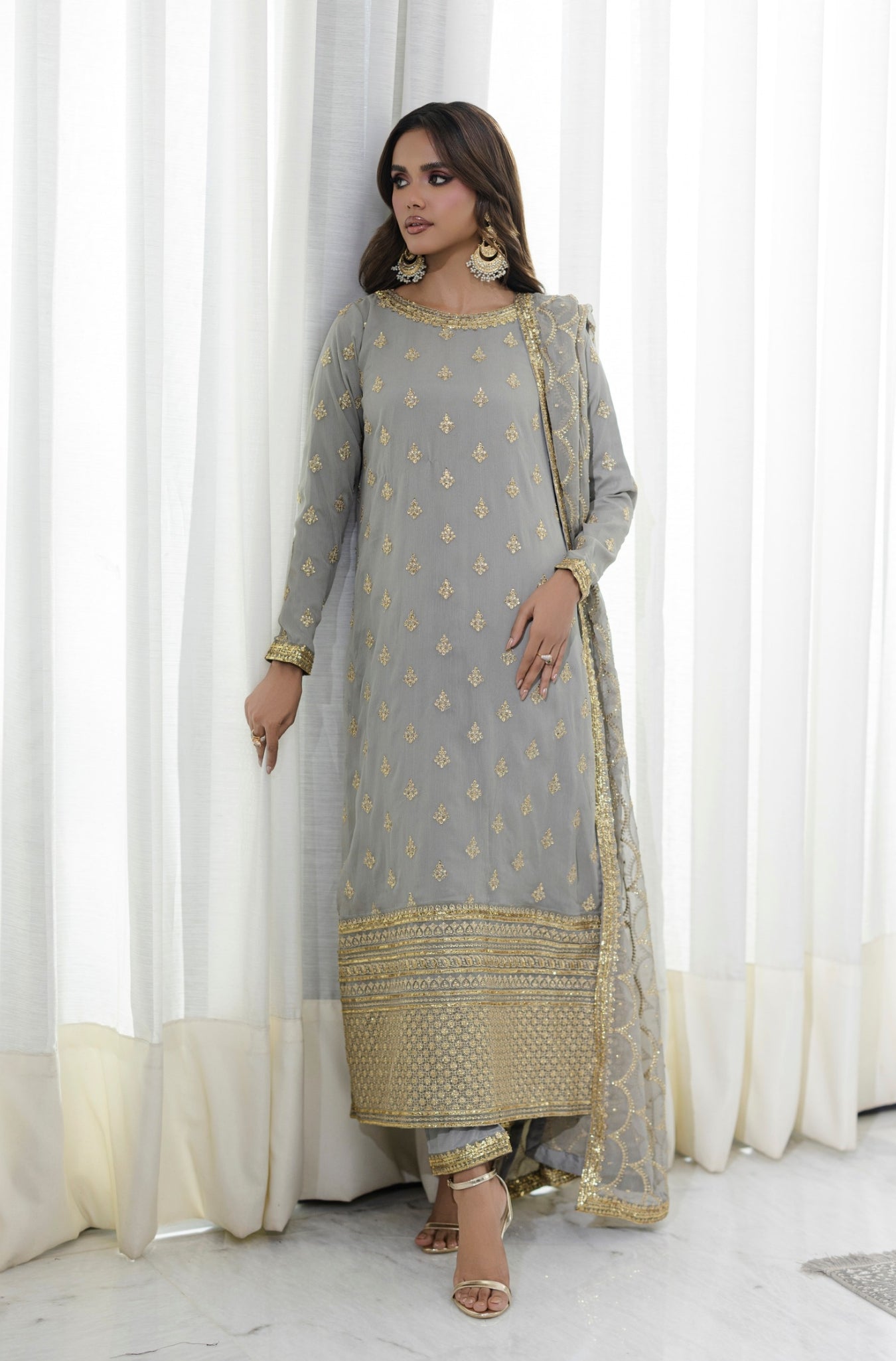 Finest Smoke Diva is crafted in soft grey chiffon that drapes gracefully over the body, giving an airy, weightless feel. The shirt and heavily embroidered dupatta showcase sophisticated, intricate golden embroidery, exuding understated luxury. Paired with an embroidered grip trouser, this ensemble balances elegance with comfort, designed for the woman who moves through life with quiet strength and timeless grace.