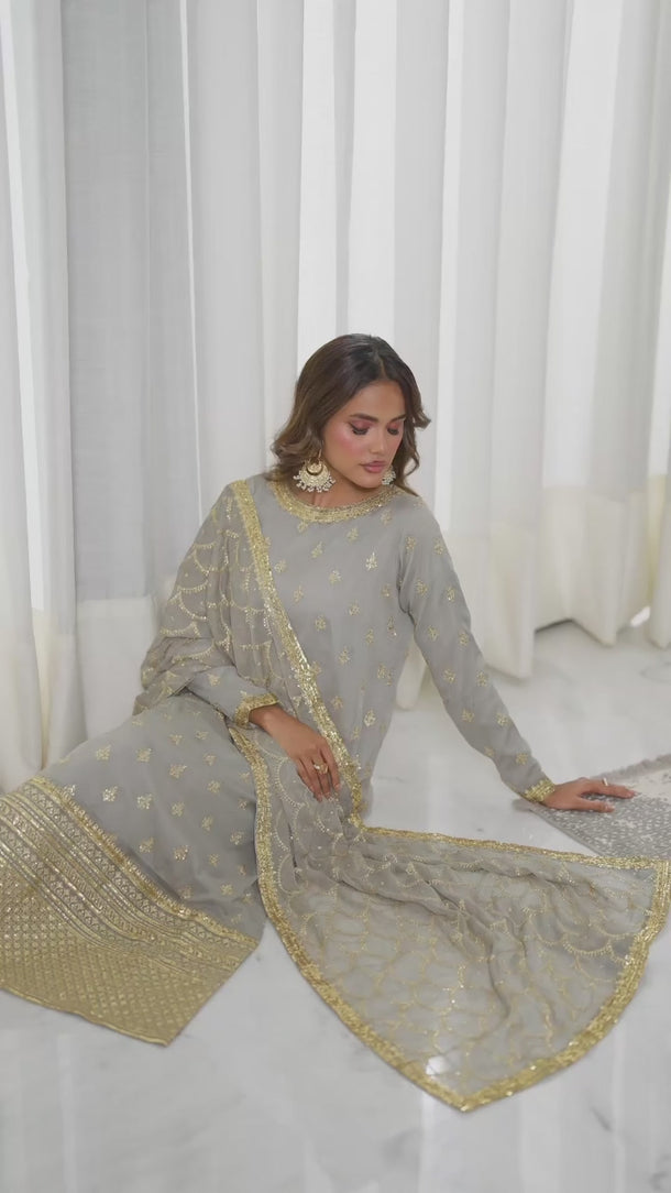 Finest Smoke Diva is crafted in soft grey chiffon that drapes gracefully over the body, giving an airy, weightless feel. The shirt and heavily embroidered dupatta showcase sophisticated, intricate golden embroidery, exuding understated luxury. Paired with an embroidered grip trouser, this ensemble balances elegance with comfort, designed for the woman who moves through life with quiet strength and timeless grace.