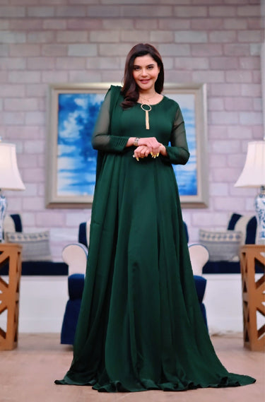 . The Most beautiful ( Bottle Green) Chiffon Kalidaar (Stitched With Inner Attached) Paired With 2.5 Yard Chiffon Dupatta. Fabric Quality And Stitching All Are First Rate.
