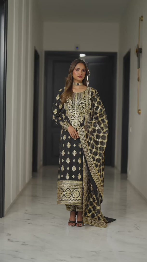 Pure Black Majesty is crafted in delicate organza, a fabric that floats softly around the body, giving an ethereal, weightless elegance. The shirt and dupatta are heavily yet tastefully embroidered in golden threads and shimmering sequins, creating a regal glow that accentuates her graceful presence. Paired with an embroidered grip trouser, this ensemble blends luxury with comfort, designed for the woman who carries strength and sophistication in every step.